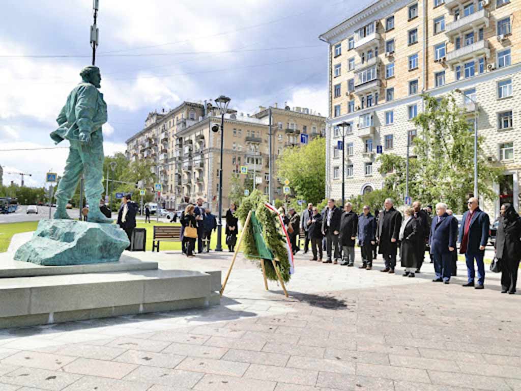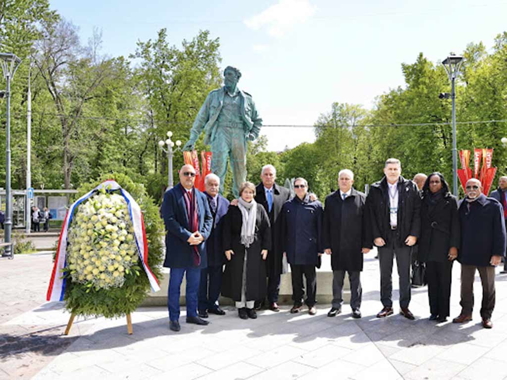 Hasta el distrito de Sokol, en Moscú, llegó el mandatario de la nación caribeña con la delegación que lo acompaña en su visita de trabajo al gigante euroasiático para colocar una ofrenda floral al invicto comandante en jefe.